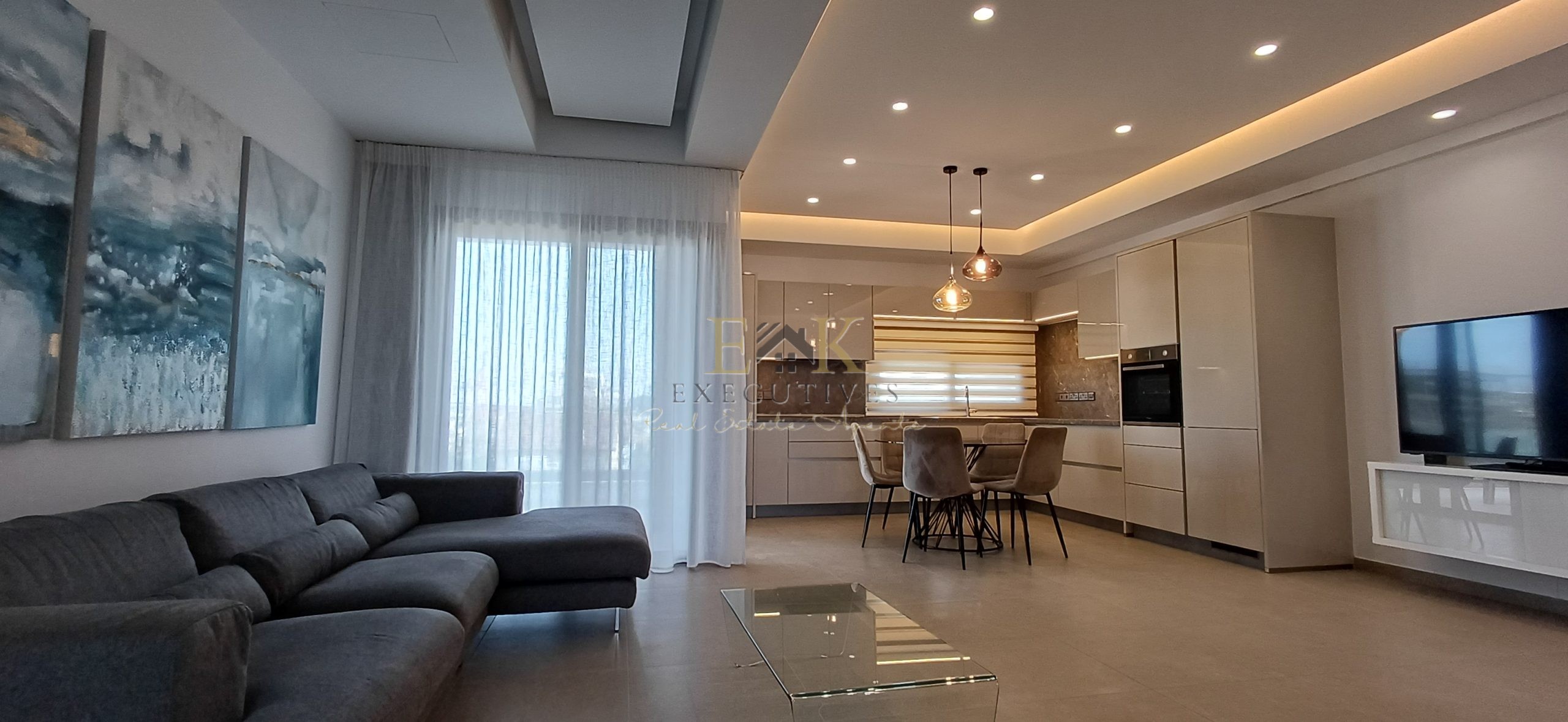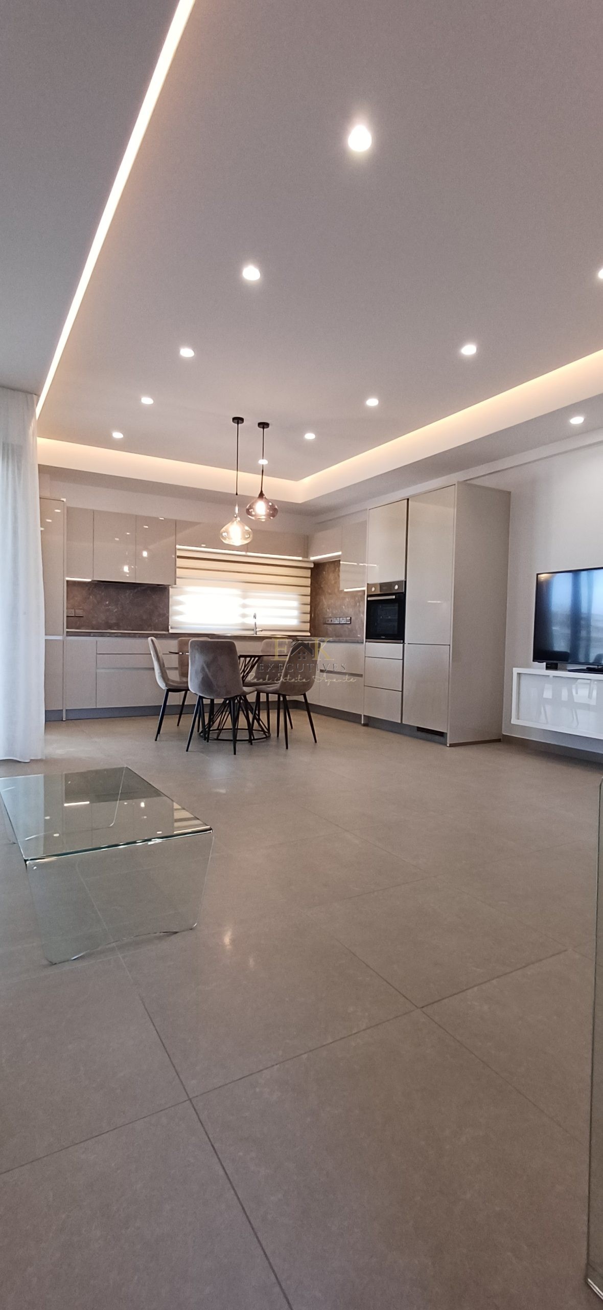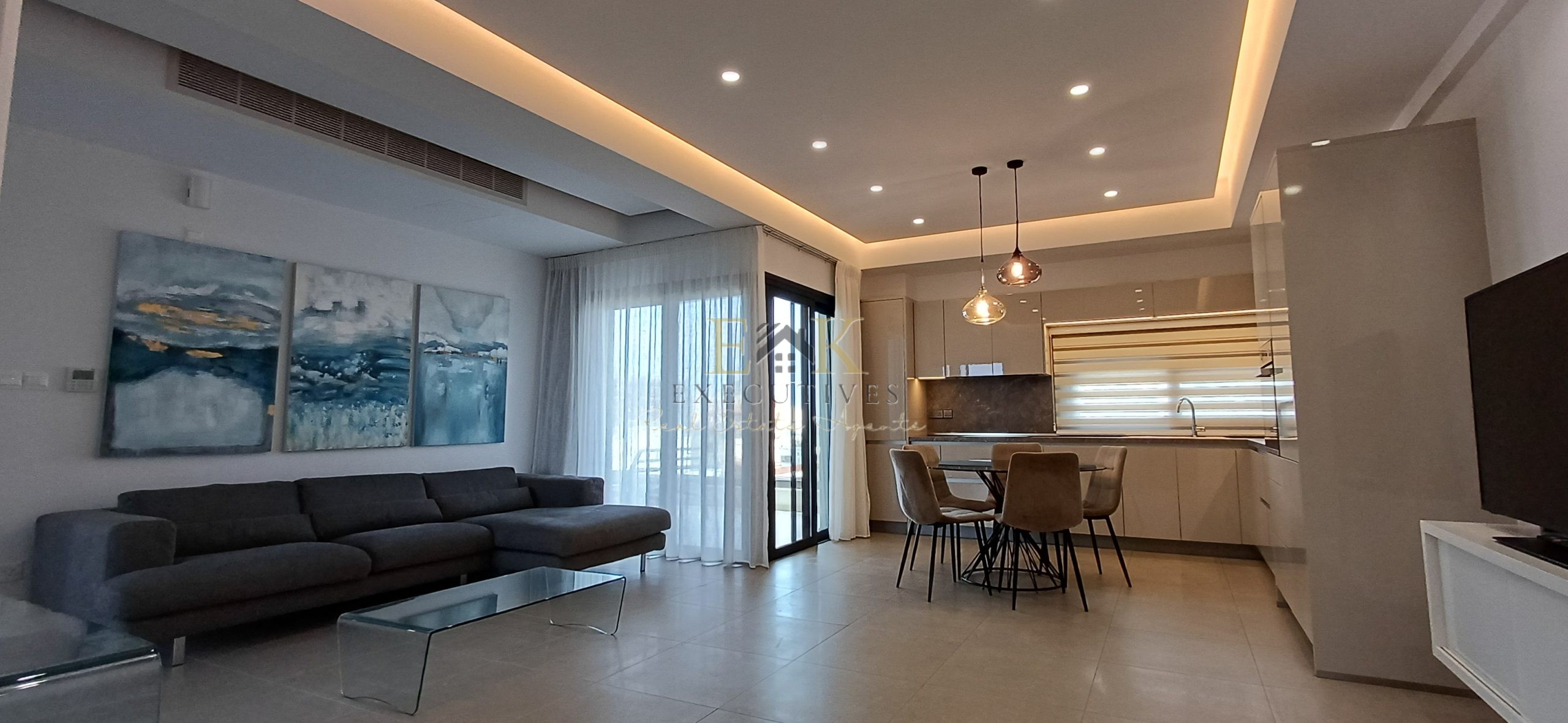 Modern Climate Control: Equipped with A/C units throughout, featuring a sophisticated hidden ceiling air conditioning system in the living room for a seamless aesthetic.