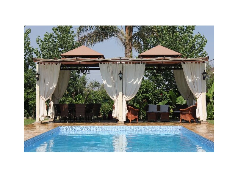 Fully-grown garden, automatic irrigation system connected with well, swimming pool 5x11m with natural stone patio, 2 gazebos,barbeque area, Italian-style mosaic fountain, rocky waterfall pond, and video remote-controlled gated entry.